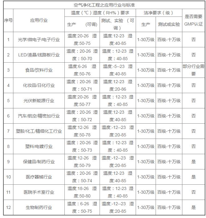 不同行業對凈化級別的標準