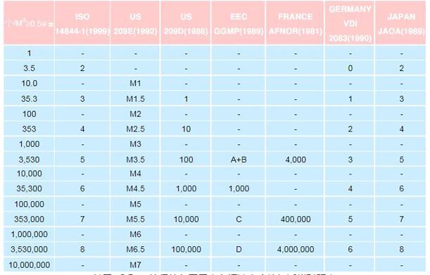 基于≥0.5μm粒徑的各國無塵車間潔凈度等級近似對照表
